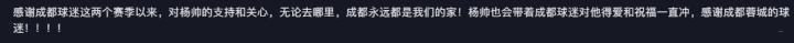 杨帅的妈妈还补刀一句:“感谢成都球迷这两个赛季的‘疯狂打call’,杨帅这小子,不管走到哪儿,成都都是他的根儿!他会带着你们的爱和祝福,一路狂奔,感谢成都蓉城的球迷们,爱你们哟!”